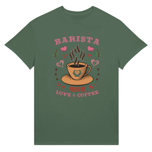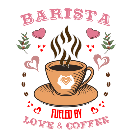 Barista T-Shirt - Fueled by Love & Coffee with Hearts and Beans Design