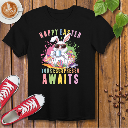 Happy Easter Coffee Style T-Shirt - Colorful Bunny Design with 'Your Eggspresso Awaits'