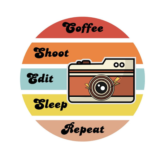 Coffee, Shoot, Edit, Sleep, Repeat T-shirt, Retro Sunset, Casual Unisex Wear, Short Sleeve Crewneck Shirt.