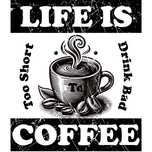 Life Is Too Short To Drink Bad Coffee T-Shirt – Coffee Cup, Distressed, Unisex Casual Wear Tee Shirt
